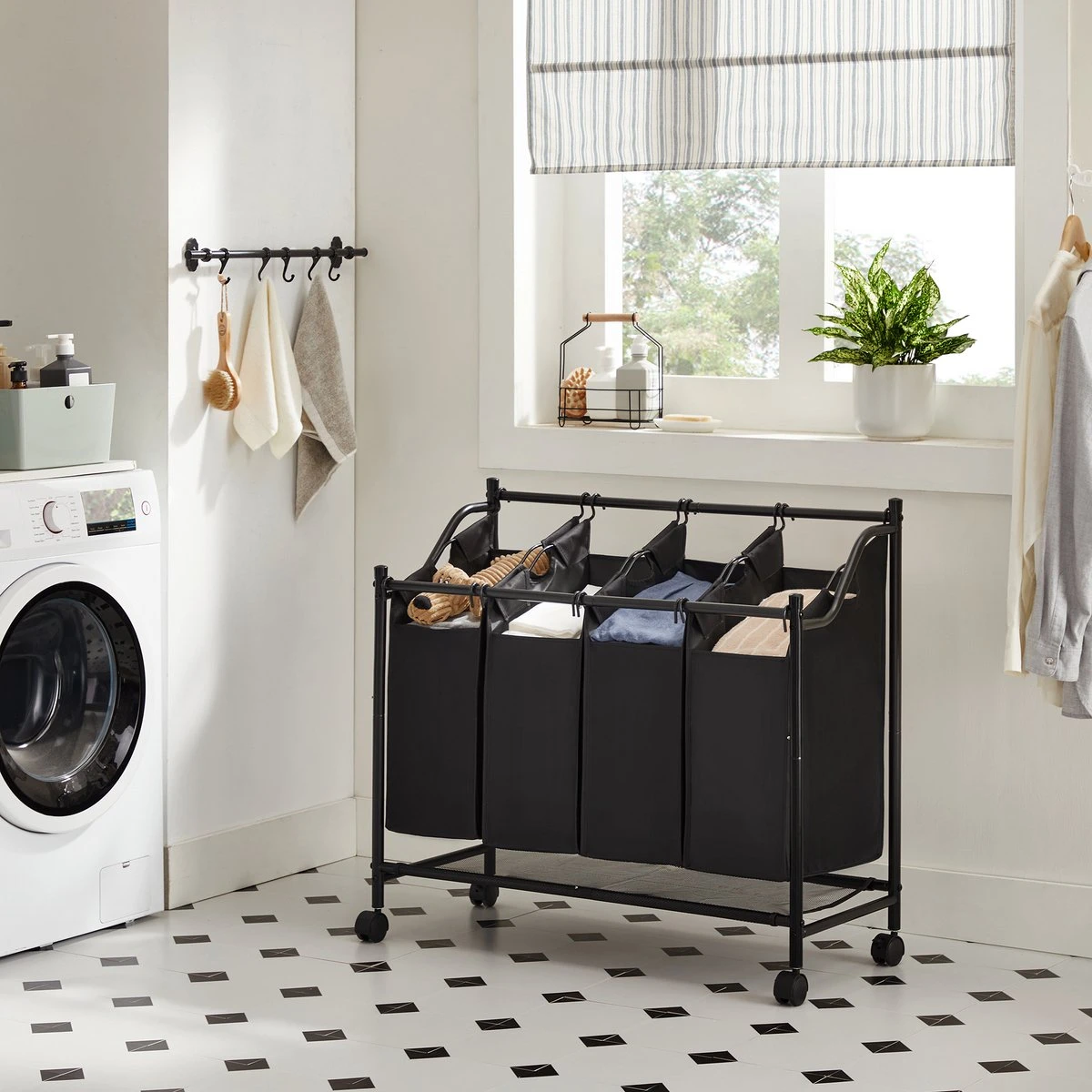 4 ruime, apart verwijderbare zakken van elk 35 liter: sorteer je was en zie meteen of je genoeg vuile was hebt om een witte, donkere of gekleurde was te laten draaien.