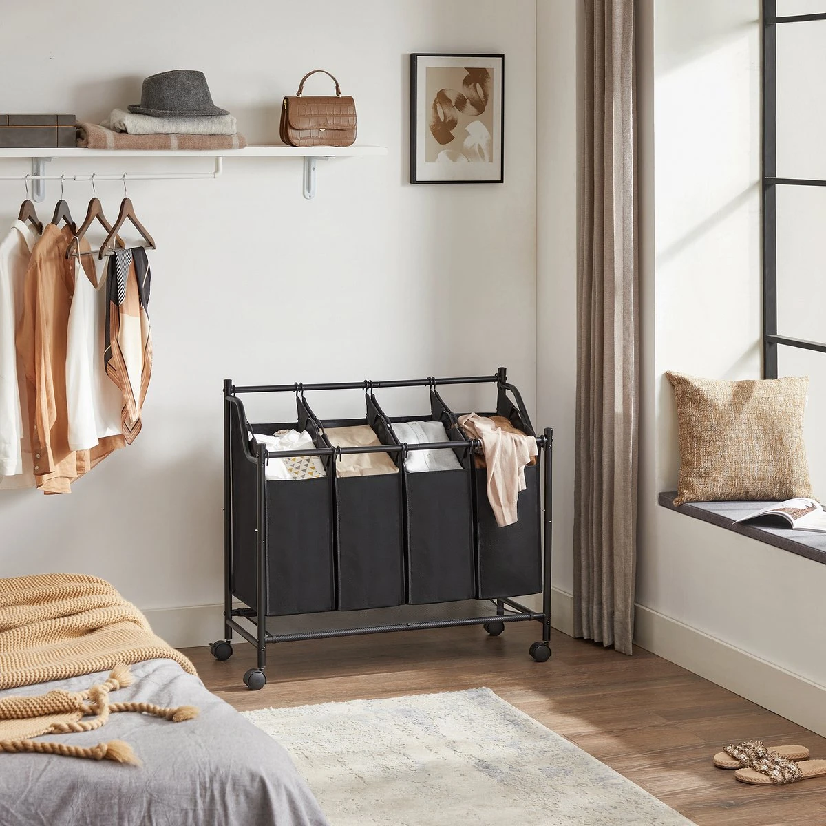 vlot rollende wielen: de wassorteerder is handig te verrijden door de 4 soepele wielen met ook een remsysteem om de mobiele wasmand vast te zetten.