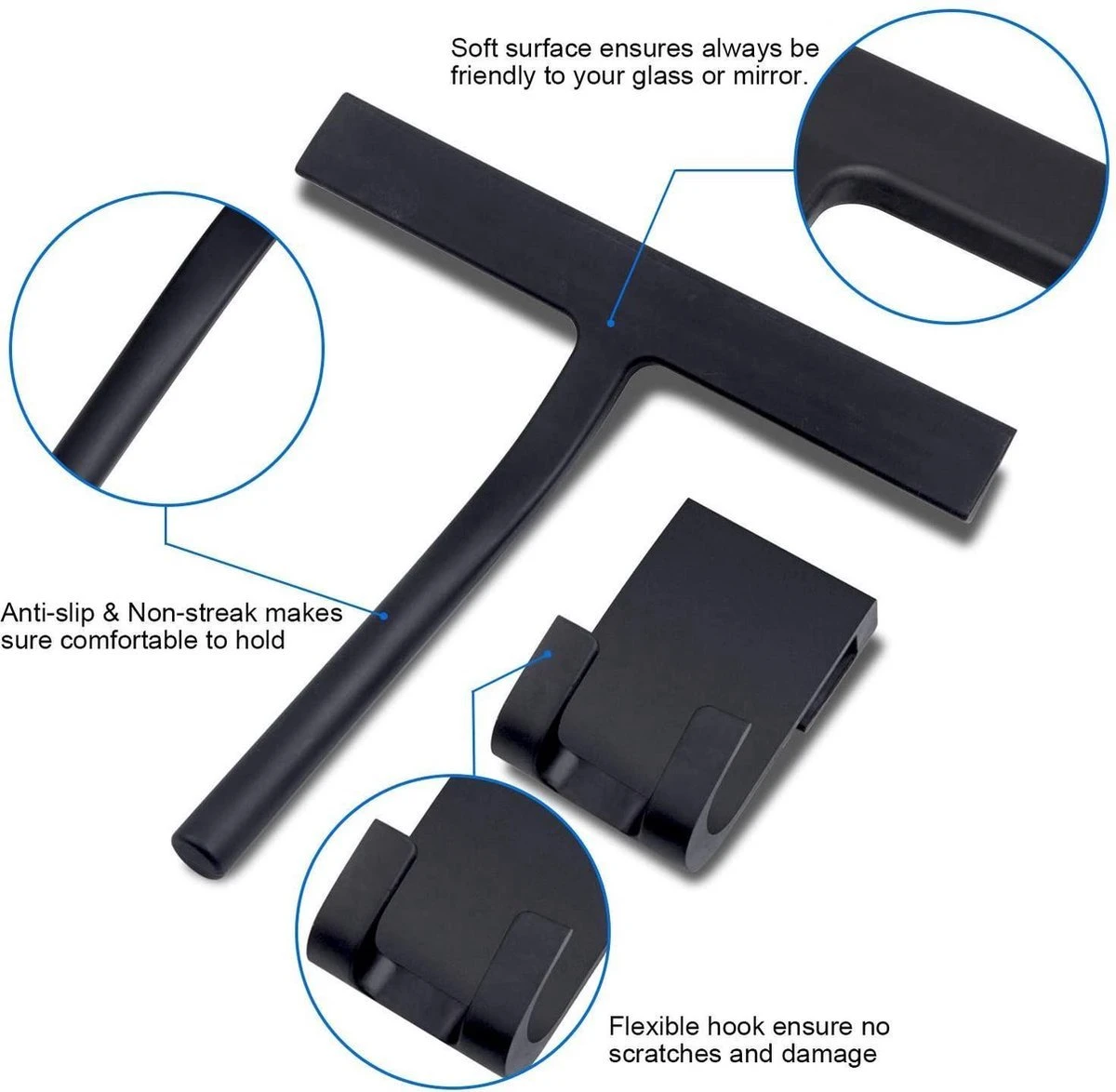 Geen schade en krassen – Solf siliconen rubber schraper is vriendelijk voor glas oppervlak. met de specail houder ontwerp, kan de wisser worden opgehangen over de bovenkant van de douche glas, geen zuignappen of kleverige houder nodig die uiteindelijk vallen en schade aan uw bad of tegel oppervlak, zelfs pijn aan uw voeten.