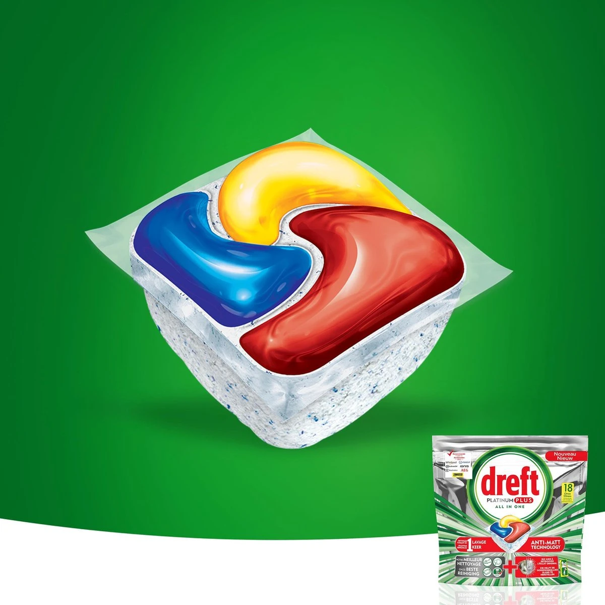 Dreft Platinum vaatwastabletten verwijderen vet en vuil en zorgen voor een stralend schone vaat én vaatwasser, op ieder programma.