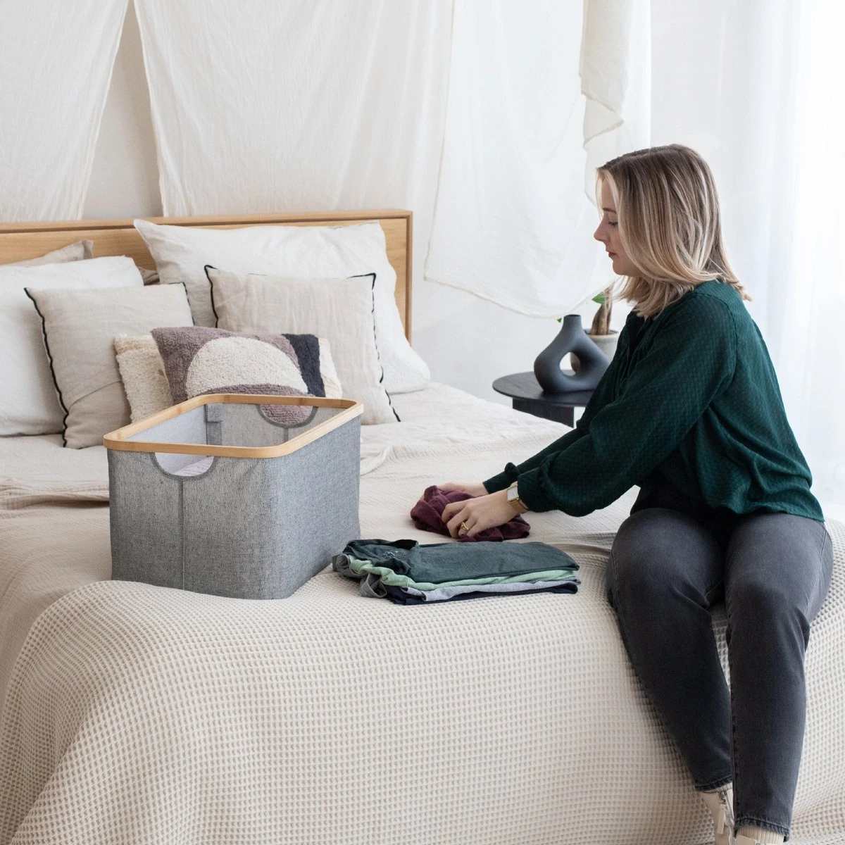 Stijlvol ontwerp – De grijs-gemêleerde stof met bamboe rand geeft het een hippe en moderne uitstraling.