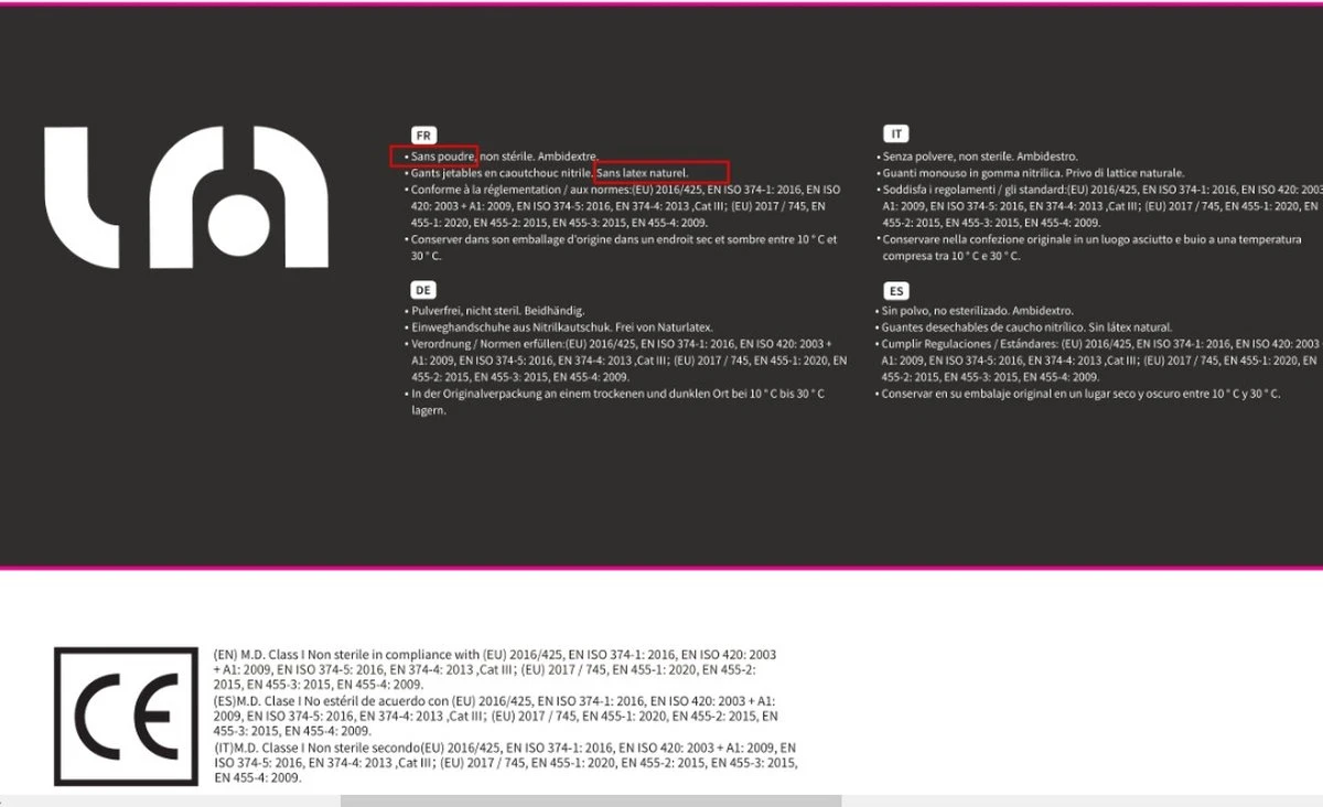 | Europese norm | EN455 / 89/686/EEG / EN374 / EN388 / EN420 / 93/42/EEG |