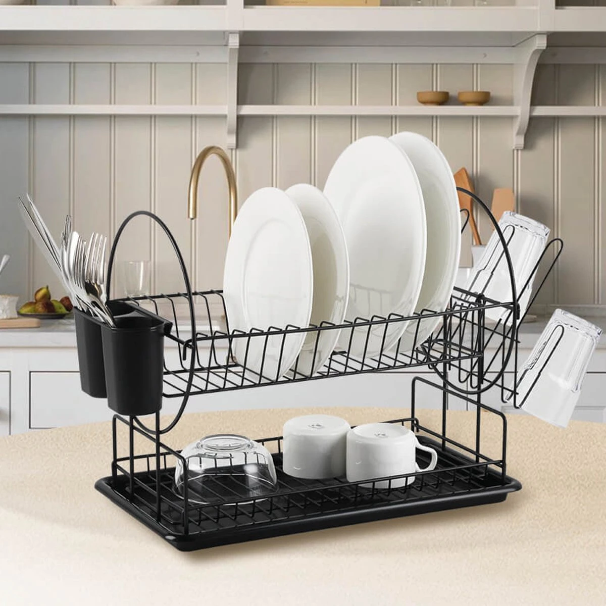 Het deksel van de droger is gemaakt van verchroomd roestvrij staal. De uitneembare lekbak zorgt voor een gemakkelijke reiniging. Door het gebruik van hoogwaardige materialen is de droger beter bestand tegen mechanische schade en vocht. Extra lekbak voor bestek en een hanger voor 6 kopjes of glazen aan de zijkanten van de lekbak. Voor extra veiligheid en comfort is de droger voorzien van antislipvoetjes die niet krassen.
