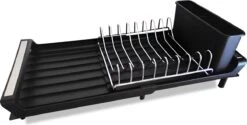 Door het unieke uitschuifbare design neemt het afdruiprek weinig ruimte in beslag maar kun je het makkelijk vergrootten wanneer het in gebruik is zodat er ruimte is voor al jouw vaat. Het bestek gedeelte kan los gehaald worden voor gemakkelijke reiniging.