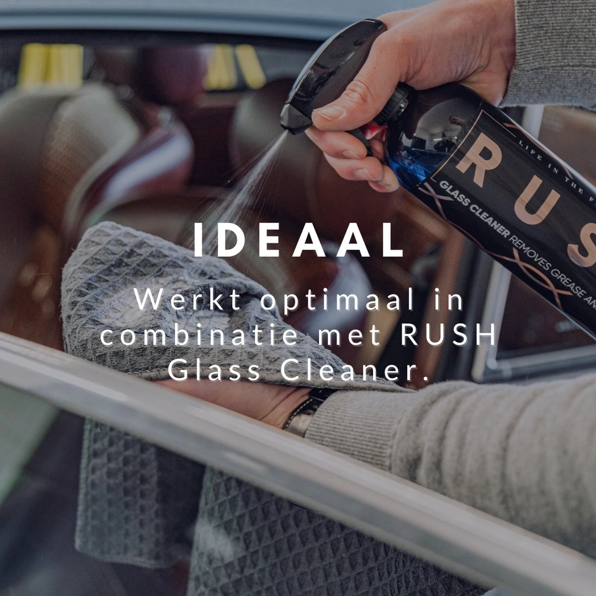 Verdeel RUSH Glass Cleaner gelijkmatig over één van de twee glasdoeken. Voor de gewenste uitstraling kun je het oppervlak meerdere keren afnemen met de natte glasdoek. Vervolgens gebruik je de tweede glasdoek om de laatste resten vuil en stof te verwijderen en de ruiten vlek- en streepvrij af te nemen.