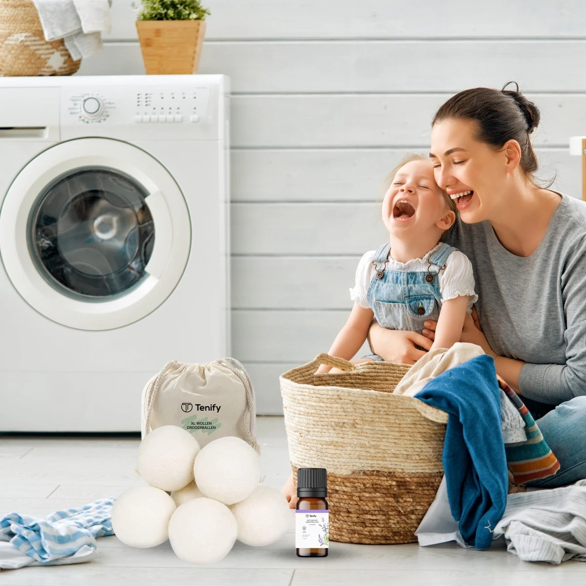 De Tenify 6 XL drogerballen set wordt geleverd met een natuurlijke lavendelolie. Wij raden aan een paar druppels olie toe te voegen aan jouw drogerballen. Dit zal zorgen voor een overheerlijk en rustgevend ruikende was.