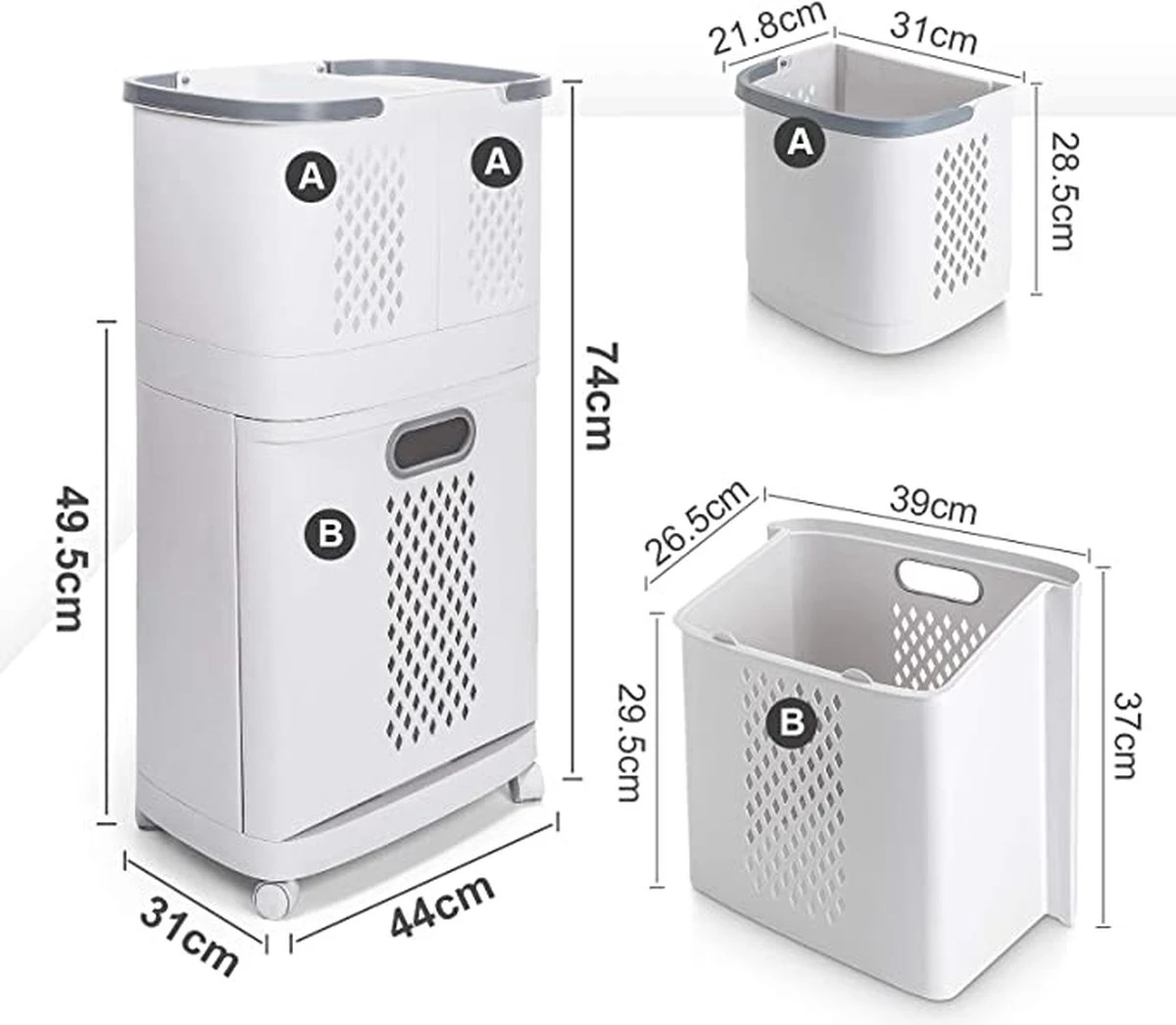 Deze wasmand is ontworpen met oog voor optimaal gebruiksgemak. Zo zijn de 2 kleine wasmanden eenvoudig te verwijderen van de trolley en kun je ze dankzij een slimme plakstrip bevestigen aan je wasmand of muur. De grote wasmand kantelt voor snelle toegang en kan ook als opzetplankje gebruikt worden wanneer de kleine manden verwijderd zijn. Door de was te sorteren bij het uitkleden, kun je tijd besparen en de was sorteren op kleur, materiaal, handwas of vele andere mogelijkheden.
